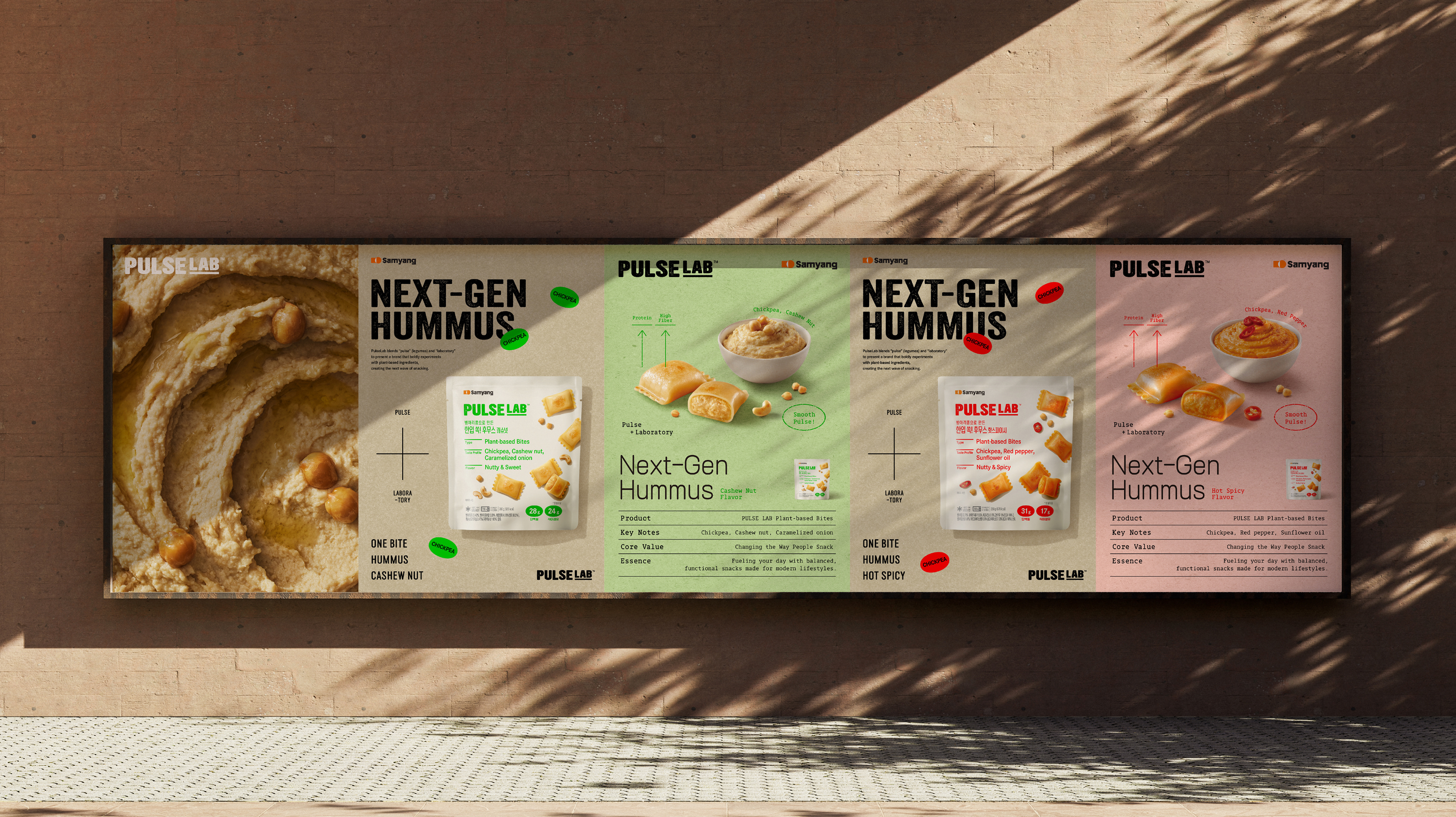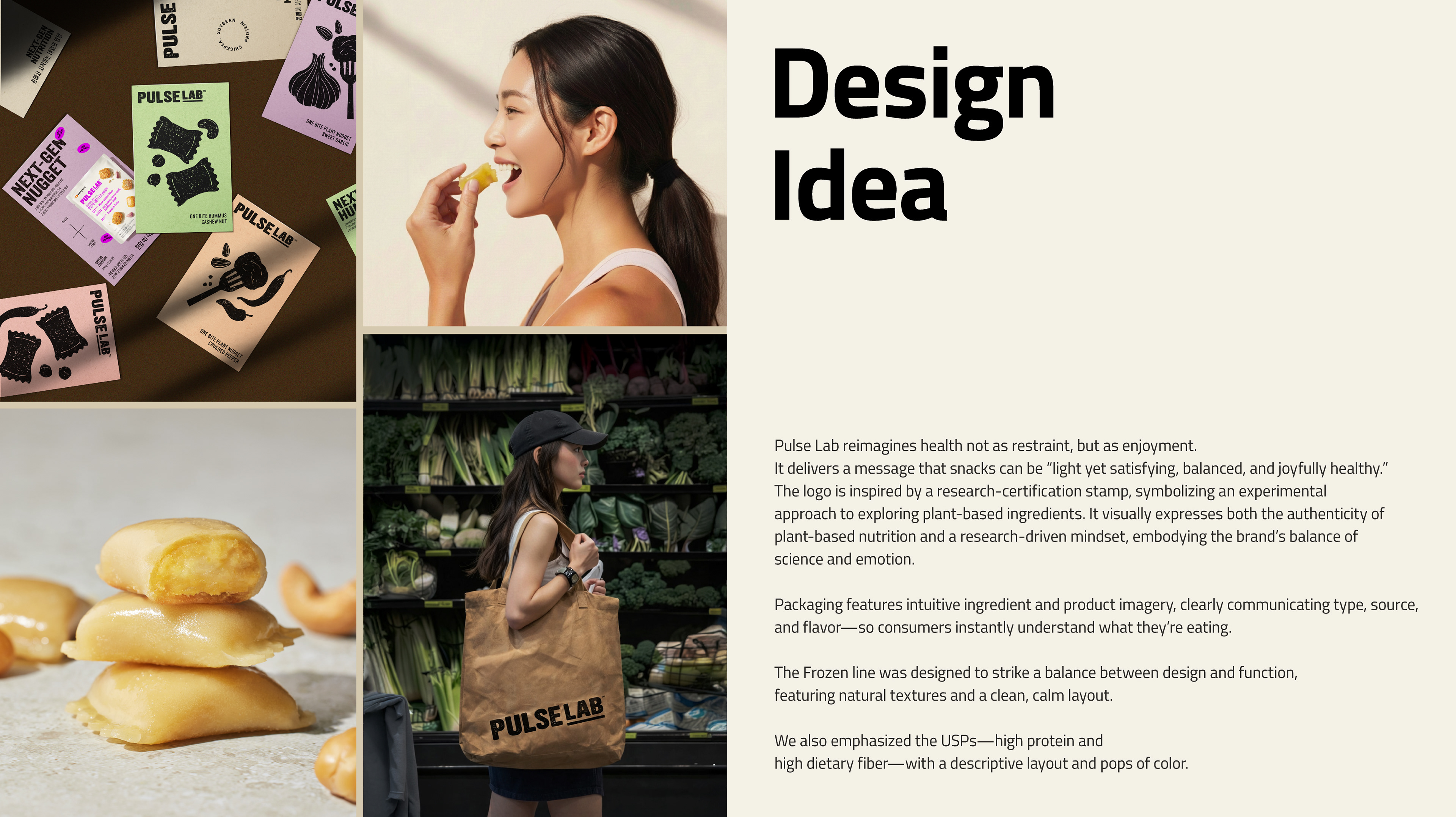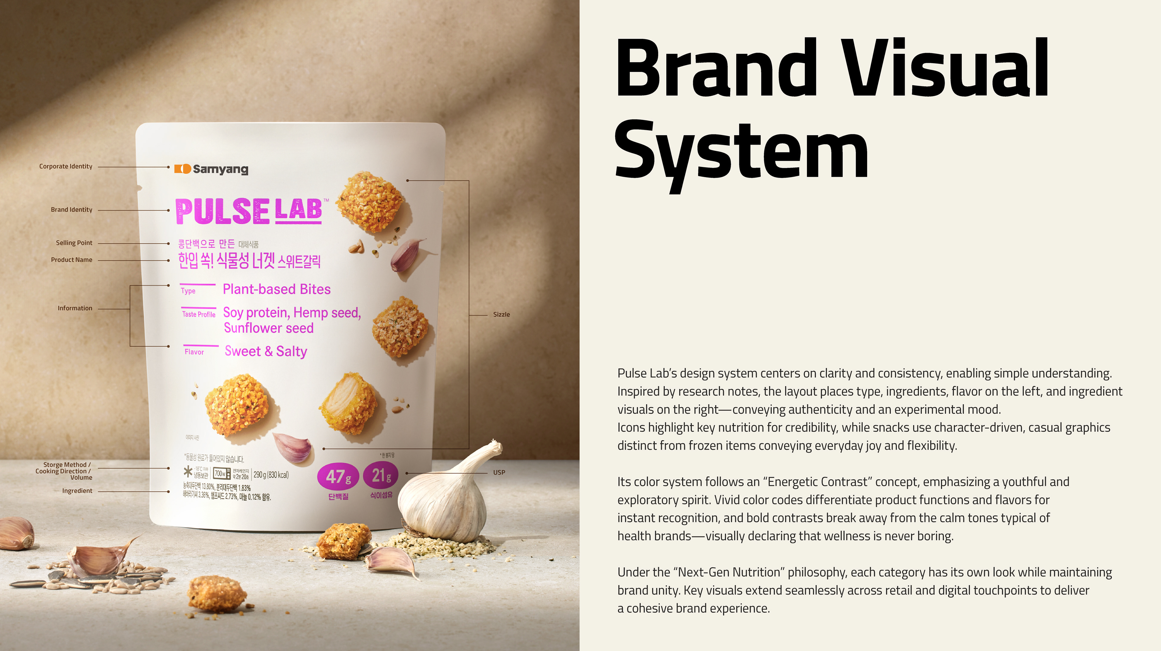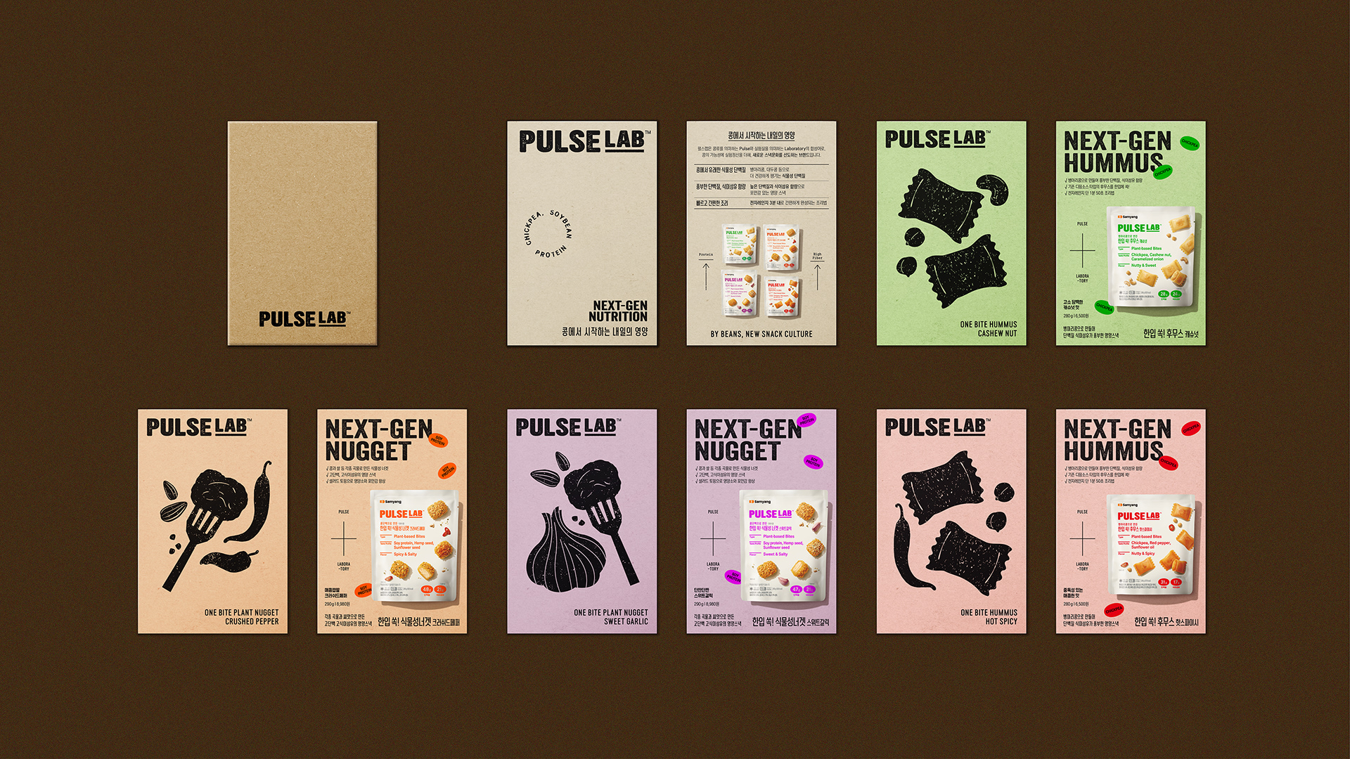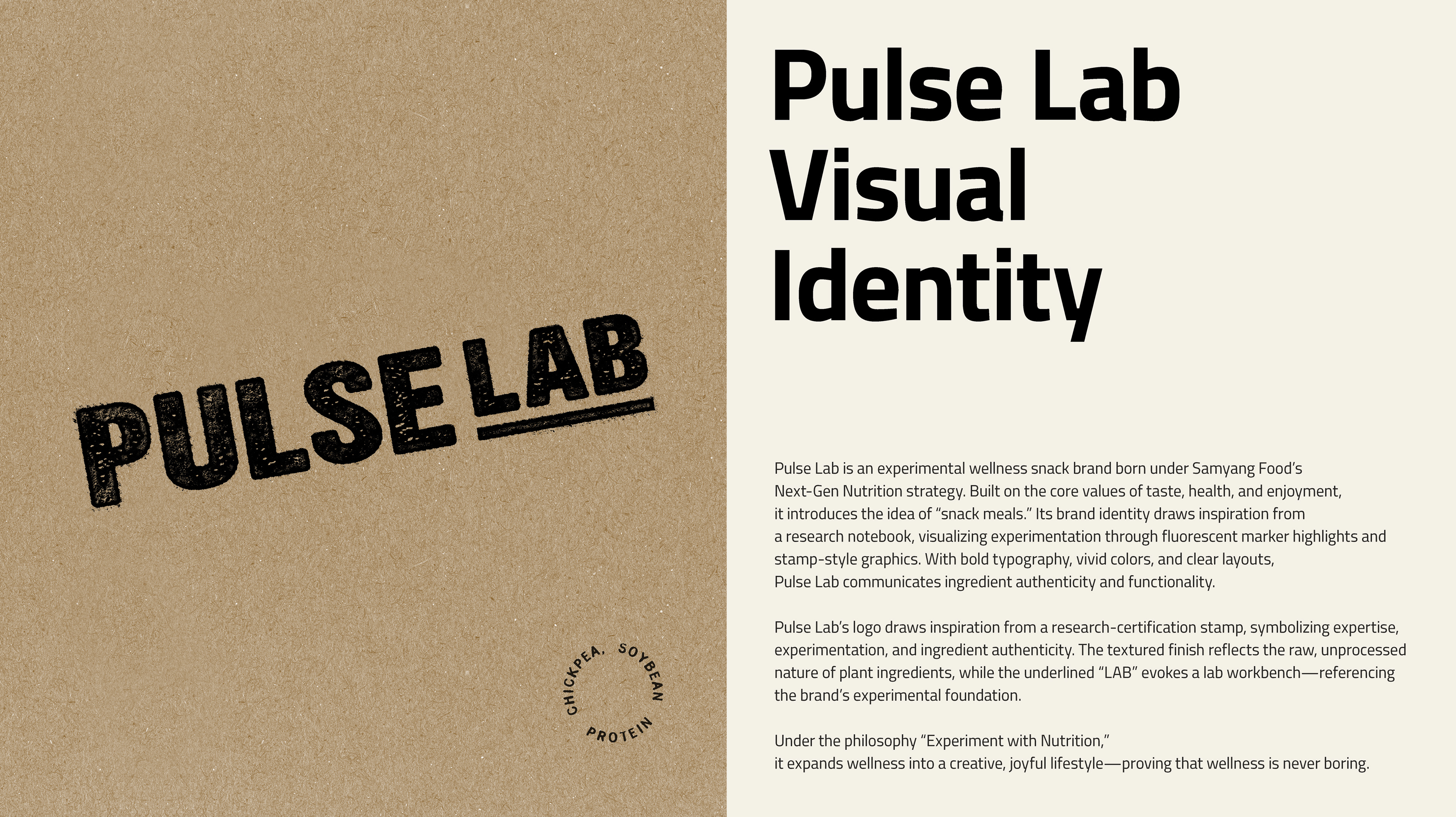 Pulselab, Rebranding Pulse Lab is an experimental wellness snack brand born under Samyang Food’s Next-Gen Nutrition strategy. Built on the core values of taste, health, and enjoyment, it introduces the idea of “snack meals.” Its brand identity draws inspiration from a research notebook, visualizing experimentation through fluorescent marker highlights and stamp-style graphics. With bold typography, vivid colors, and clear layouts, Pulse Lab communicates ingredient authenticity and functionality. 펄스랩은 삼양식품의 Next-Gen Nutrition 전략 아래 탄생한 실험적 웰니스 스낵 브랜드입니다. 맛(Taste), 건강(Health), 즐거움(Enjoyment)이라는 핵심 가치를 기반으로, ‘스낵 밀(Snack Meal)’이라는 새로운 개념을 제안합니다. 브랜드 아이덴티티는 연구 노트에서 영감을 받아 형광 마커 하이라이트와 스탬프 스타일 그래픽을 통해 실험의 과정을 시각적으로 표현합니다. 대담한 타이포그래피, 선명한 컬러, 명확한 레이아웃을 통해 원료의 진정성과 기능성을 직관적으로 전달합니다. 2025